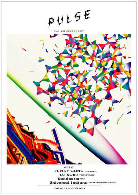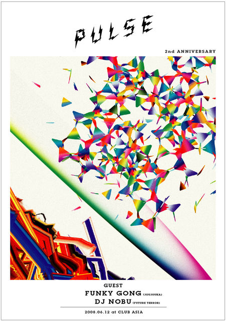 告知失礼します!!! [PULSE 2nd anniversary] @渋谷 club asia 2008.06.12(thu) open/start 23:00 Door 3000yen/w1d with flyer 2500yen/w1d before 24:00 2000yen/w1d 《MAIN FLOOR》 <GUEST DJ> FUNKY GONG (JOUJOUKA) http://www.myspace.com/funkyvolcano DJ NOBU (FUTURE TERROR) http://www.myspace.com/djnobuft <GUEST VJ> Kaz (JOUJOUKA) Masato TSUTSUI (http://adsr.jp) <LIVE> SLIPSTREAM (POPGROUP/PULSE) http://www.myspace.com/ssslipstreammm SOEGI (PULSE) http://www.myspace