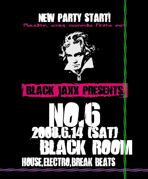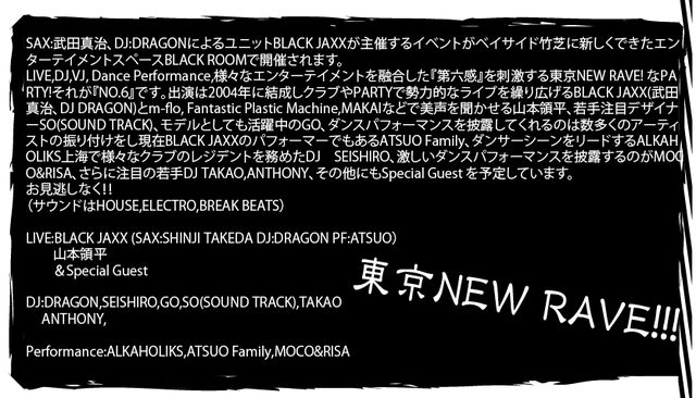 管理人さまDJのドラゴン、と申します。 新しいイベントの告知失礼いたします。 SAX:武田真治、DJ:DRAGONによるユニットBLACK JAXXが主催するイベントがベイサイド竹芝に新しくできたエンターテイメントスペースBLACK ROOMで開催されます。 LIVE,DJ,VJ, Dance Performance,様々なエンターテイメントを融合した『第六感』を刺激する東京NEW RAVE! なPARTY!それが『NO.6』です。出演は2004年に結成しクラブやPARTYで勢力的なライブを繰り広げるBLACK JAXX(武田真治、DJ DRAGON)とm-flo, Fantastic Plastic Machine,MAKAIなどで美声を聞かせる山本領平