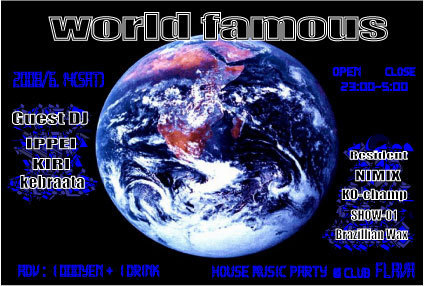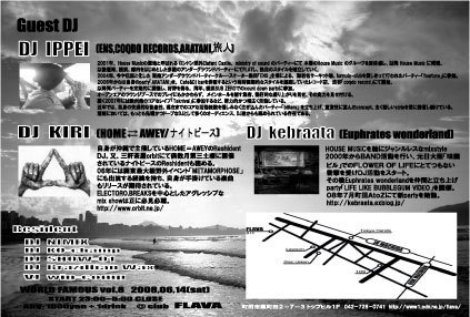 今回のGest DJには、EMSやARATANIなどの数々のPartyを主催し、湘南のダンスシーンをリードしてきたminimal DJ IPPEI、さらに沖縄にて開催されているHOME=AWEYを主催し、あの関東最大級イベント「METAMOLPHOSE」にも出演したBreaks DJ KIRI、町田からはEuphrates wonderland「LIFE LIKE BUBBLEGUM VIDEO」の主催 DJ Kebraataを向かえ、World Famousを盛大に盛り上げます