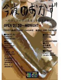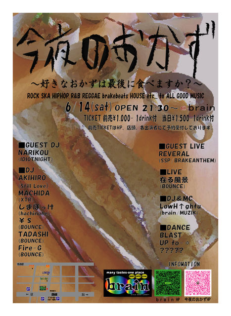 6/14(sat) @brain(青森) むつからもみんなで来ちゃう!? brainで新しいパーティーが始まります! 前売りあるのでメールください! 『今夜のおかず』 〜好きなおかずは 最後に食べますか?〜 ■OPEN 21:30 ■TICKET 前売\1,000-1drink付 当日\2,000-1drink付 ■GUEST DJ NARIKOU (IDIOTNIGHT) ■GUEST LIVE REVERAL (S.S.P/BRAKEANTHEM) ■DJ AKIHIRO (StillLove) MACHIDA (XTR) しまほっけ(HACHINOHE) Fire-G (BOUNCE) \$ (BOUNCE) TADASHI (BOUNCE) ■Live 在る風景 (BOUNCE) ■MC&DJ LowH↑ghtu (brain/MUZIK) ■DA