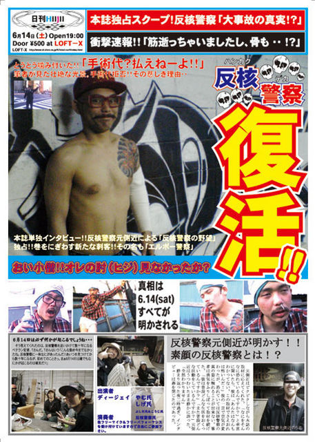 反核警察復活祭 「頼むから手術代は払ってよスペシャル!!」 数々の敵をぶちのめして来た反核警察が大事故に見舞われてから 早何日・・・・ 事故の様子http://jp.youtube.com/watch?v=i548aCrfhb0 初めはショックで立ち上がる事も出来ず、まるで生まれたての子牛の ように震えていた反核警察!! だが、やつは一つの約束を守る為に立ち上がった!! 「なんとしてもオレは・・・・手術代を払う・・・・「グッフェ!!」それは・・・・それは・・・・約束なんだよ!!」 反核警察の仲間達はそんな彼を見てこういった・