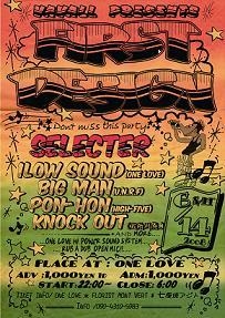 VAVALL PRESENTS 2008年6月14日(SAT)PM22:00〜 チケット:前売/\1,000(1D)・当日/\1,000 取扱店:ONE LOVE/FLORIST MONT VERT/七厘焼アジト INFO:090‐4310‐5983 〜SELECTER〜 1LOW SOUND(ONE LOVE) BIG MAN(U.N.R.F) PON-HON(HIGH FIVE) KNOCK OUT(五所川原)