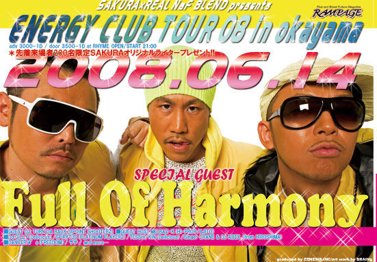2007年12月にokayama RHYMEで岡山のCLUBイベントでは異例の400人を超える動員数を記録した『Full Of Harmony』がNEW ALBUMをリリース今回『ENERGY』の全国リリースツアーを岡山で開催します