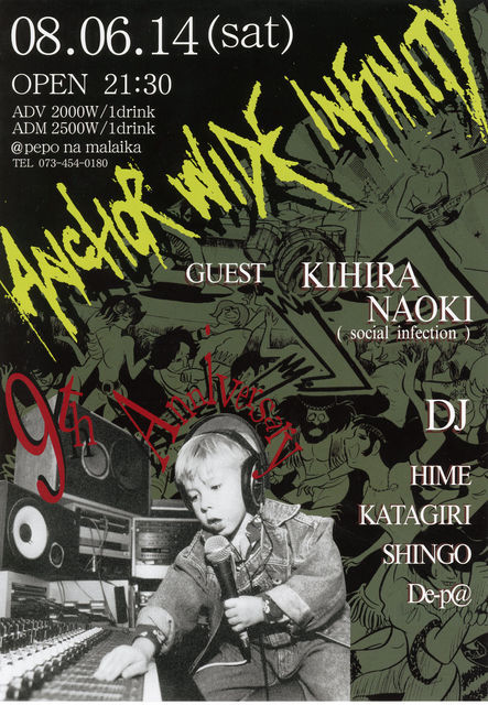 ☆祝!!9周年☆ ペポナマライカにて偶数月第2土曜に開催されている ANCHOR WIDE INFINITYがついに9周年! ゲストに関西を中心に、全国、海外で活躍するKIHIRA NAOKIさんを迎えます♪ 最近ハイペースで和歌山に登場しているKIHIRAさんですが、 この日はなんと4時間のlong setを予定しています!! 是非、ワン・アンド・オンリーなグルーヴを体感してください!! _____________ 08.06.14.sat ★ANCHOR WIDE INFINITY★ 9th Anniversary!! @pepo na malaika open/21:30 adv - 2000yen(1drink付)
