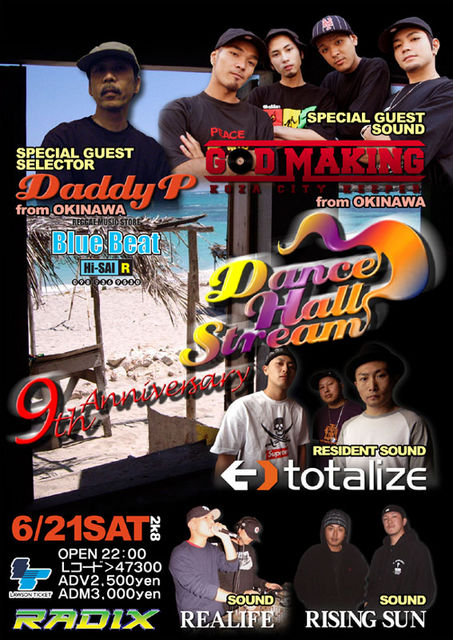 6月21日土曜日はTOTALIZEのMAIN SELECTOR HAYASSENがWILD SWAN時代からKEEPしているDANCE!DANCEHALL STREAMの9周年記念DANCEとなります。沖縄からno.1 JUGGLIN SOUND GOD MAKINGと沖縄
