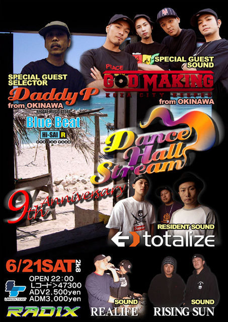 6月21日土曜日は俺がWILD SWAN時代からKEEPしているDANCE!DANCEHALL STREAMの9周年記念DANCEとなります。沖縄からno.1 JUGGLIN SOUND GOD MAKINGと沖縄 FOUNDATION MASTER DADDY Pを招きOLDIES〜最新JUGGLINと言う内容で朝まで