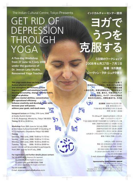 インド大使館インド・カルチャーセンターのヨガ講師をつとめる ジーバン・ラタ・シュクラ博士が「ヨガでうつを克服するワークショップ」の 記念講演を開催します。 ↑上の写真(ポスターです)をクリックすればおおまかな内容が読めます。 「ヨガでうつを克服するワークショップ記念講演」 ●日時:2008年6月27日(金) ●会場:麻布区民センター(港区六本木5-16-45) ●時間:18:30~20:00 ●定員:250名 ●料金:無料(申し込み必要) ●申し込み&お問い合わせ:Tel. 03-3230-8515 (岡本まで) まだ席に余裕がありますが