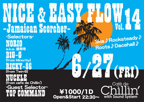 ◆NICE & EASY FLOW◆14 【Selectors】 NORIO a.k.a. 道明寺 BIG-G(from Minority) RICKY-86(from Twin-B) NUCKLE (from cafe de Chillin') 【Guest Selector】 TOP COMMAND 6/27(金) cafe de Chillin'@水戸 START/22:30 ADM: \1000 /1Drink