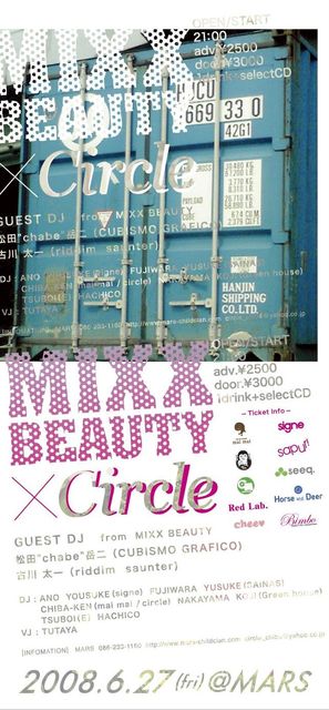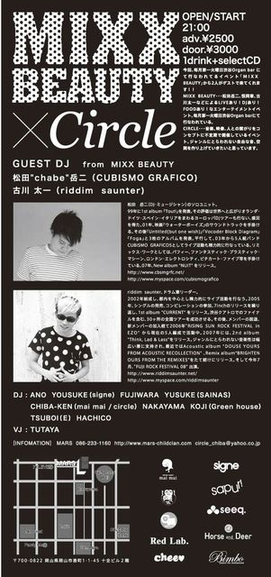 いよいよ明日です!! 『MIXX BEAUTY × CIRCLE』 2008.6.27(fri) @ MARS okayama GUEST DJ : 松田"chabe"岳二(CUBISMO GRAFICO) 古川 太一 (riddim saunter) ・・・ from MIXX BEAUTY DJ : ANO YOUSUKE (signe) FUJIWARA YUSUKE (SAINAS) CHIBA-KEN (mai mai / circle) NAKAYAMA KOJI (Green house) TSUBOI(E) HACHICO(girls★boogie) RAMP VJ : TUTAYA 前売り 2500円 当日 3000円 *共に1drink+select CD付き OPEN/START : 21:00~ [INFOMATION] MARS 086-23