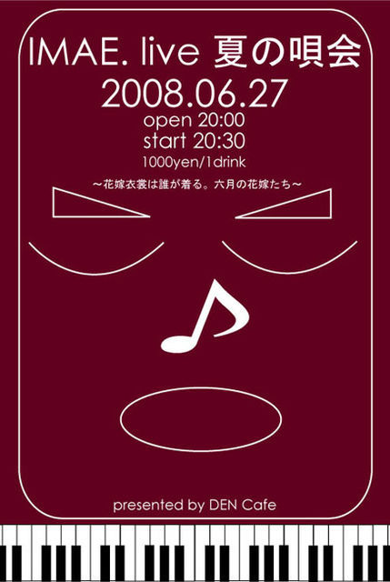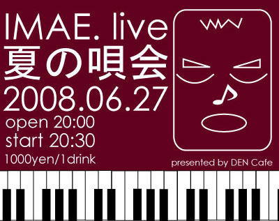 IMAE.ライブ2008 『いまえ。夏の唄会』 〜花嫁衣裳は誰が着る。六月の花嫁たち。〜 2008年6月27日(金) 20:00open 20:30start 1000yen/1drink いまえ。の夏がやってまいりました。 今年の夏は去年よりも熱いぜぇ!! 夏の扉を開ける 激しく さわやかな歌声にぜひ耳を傾けてくださいね。 イマエライブが終わると 本格的な夏がやってきます!! この夏もイベントてんこもり!! 楽しくそしてスマイルでまいりましょう。