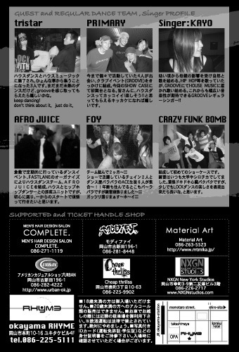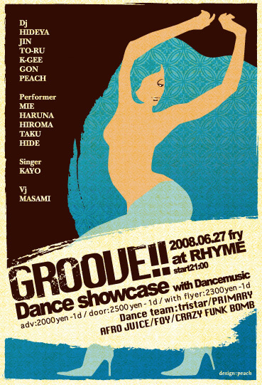☆GROOVE!!☆ DANCE SHOWCASE with Dancemusic 2008.06.27(金曜日) START 21:00〜 ■adv 2000yen-1d ■door 2500yen-1d ■with flyer 2300yen-1d ジャンル ダンスミュージック ■Dj's」 HIDEYA JIN TO-RU K-GEE GON PEACH ■PERFOMER MIE HARUNA HIROMA TAKU HIDE ■SINGER KAYO ■VJ MASAMI ■DANCE TEAM TRISTAR PRIMARY AFRO JUICE FOY CRAZY FUNK BOMB 今回はスペシャルにDANCE SHOWCASE があります! ジャンルもHOUSE DANCEか