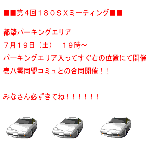☆☆☆☆☆☆☆☆☆☆☆☆☆☆☆☆☆☆☆☆☆☆☆☆☆☆☆☆☆☆☆☆ 開催日時:2008/7/19 土曜日 19時開始 場所 :都築パーキングエリア 必要な物:ジャンケン大会用プレゼント ☆☆☆☆☆☆☆☆☆☆☆☆☆☆☆☆☆☆☆☆☆☆☆☆☆☆☆☆☆☆☆☆ 開催から1〜2時間後にジャンケン大会を実施します。 各自何か不必要な物があれば持参お願い致します。 車部品に限らず、ヌイグルミ等々何でもOKです! ご協力お願い致します。 ☆☆☆☆☆☆☆☆☆☆☆☆☆☆☆☆☆☆☆☆☆☆☆☆☆☆☆☆☆☆☆☆ バーベ