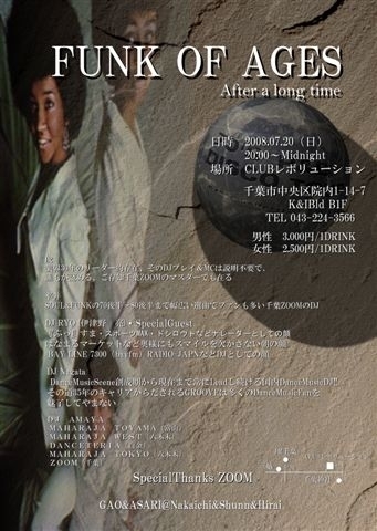 〜今ここに復活します!〜 ◆◇◆◇◆◇◆◇◆◇◆◇ ◇FUNK OF AGES returns◆ ◆◇◆◇◆◇◆◇◆◇◆◇ date :7/20(Sun)翌日休日 open :20:00〜 close:Midnight place:CLUB レボリューション 千葉市中央区院内1-14-7 K&Iビル B1 043-224-3566 fee :♂\3000(1D)♀\2500(1D) ♪70s〜80s Soul・Funk・Disco・ R&B♪ 〜DJs〜 ♪SHUNN(Zoom) http://mixi.jp/show_friend.pl?id=10192272 ♪HIRO (Zoom) http://mixi.jp/show_friend.pl?id=11460566 ♪AMAYA(Zoom) http://mixi.jp/show_friend.