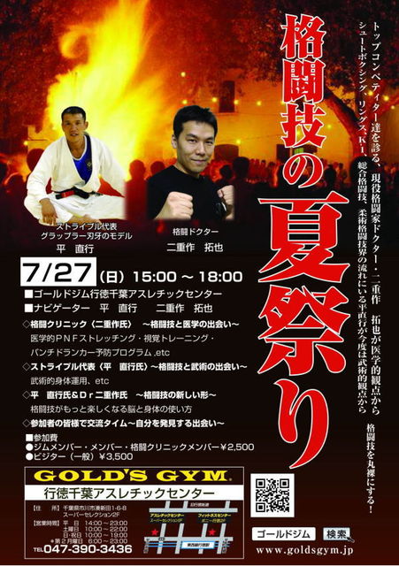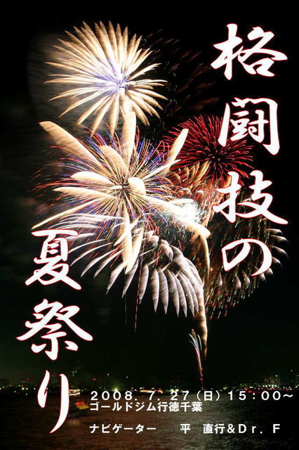 格闘技とビールで、暑い夏をぶっ飛ばそう!!! ということで、格闘技の夏祭り2008はかなり豪華です。 夏祭りのナビゲーターは、2人。http://mixi.jp/view_bbs.pl?id=28646885&comm_id=187416 大道塾、シューティング、シュートボクシング、リングス、正道会館等、格闘技の王道を歩んできた格闘技のパイオニア・リアルグラップラーバキこと平 直行(ストライプル代表http://mixi.jp/view_community.pl?id=665441) そして、格闘技を医学に徹底追求、実践する格闘技ドクター、二重作 拓也(格闘クリニック代表http://www.kakukuri