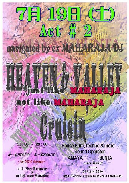 いよいよ明後日、『土曜日』19日 【H&V Cruisin’ACT 2】の開催です 毎回、異常な盛り上がりをみせるこのイベント 今回も新ネタHOUSE,TECHNO,EUROをひっさげて、僕とBUNTAがGROOVYな音と光の空間をお届けします(自作REMIXも発表) 今回、BACK TO BACKもやってみようかと・・・ 【EVENT DETA】 PLACE: Discoteque Bar★★Zoom★★ DATE: 7月19日(土曜日) 20:00(OPEN) 21:00〜MIDNIGHT ADDRESS: 千葉県千葉市中央区登戸1−13−22の2階 TEL: 0