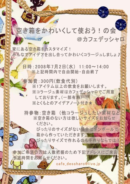 家の中がビーズや(それは私)ボタンや(それも私)文房具、化粧品など細々したもので片付かなーい!あなた。 手近な食品の箱や日用品の箱はサイズが微妙に違う・・・生活感ありすぎ・・・ならば、少し手を加えてぴったりサイズに、お気に入りのデザインに、してみませんか? コラージュと言っても難しく考えることはありません。 好きな絵の切り抜き、素敵なデザインの布などを貼るだけで、「とりあえずの箱」から「お気に入りの箱」に変わります! みんなでわいわいシェアし合ったり自慢し合ったりしてマイ箱作りましょう♪ あ、おいしい珈琲も忘れ