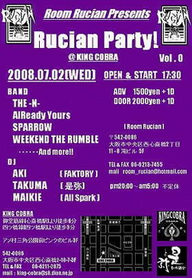 2008.7.2(wed) -ROOM RUCIAN Presents- 『RUCIAN PARTY!』 vol.0 @KING COBRA http://king-cobra.net/first.html 大阪市中央区西心斎橋2-18-7-3F Tel & Fax : 06-6211-2875 OPEN & START 17:30 ADV \1500(+1D \500) DOOR \2000(+1D \500) ☆ LIVE ☆ THE-N- SPARROW WEEKEND THE RUMBLE AlReady Yours ...and more ★ DJ ★ AKI (FAKTORY) TAKUMA (是弥) MAIKIE (All Spark)