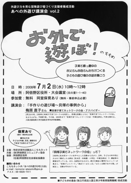 あべの外遊び講演会vol.2 お外で遊ぼ!のすすめ 従来の公園ではなく、子育て真っ最中のお父さんお母さんたちが自らつくる、 子どもの遊び場「冒険遊び場(プレーパーク)」。 大阪にもそんな魅力的な場が、貝塚にあります。 「貝塚子育てネットワークの会」という会のなかで 遊びの趣旨に賛同したメンバーが、その活動を行っています。 その中心として活動されていた梅原直子さんにお越しいただき、 貝塚の遊び場のお話を伺います。 「貝塚子育てネットワークの会」は、1988年(20年前!)に 乳幼児サークルと地域の公民館とで立ち上がっ