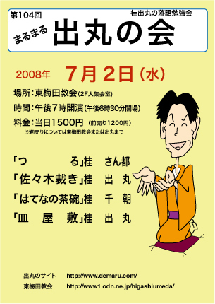 場所:東梅田教会 時間:午後7時開演 料金:当日1500円前売り1200円 演目:さん都「つる」 出 丸「佐々木裁き」 千 朝「はてなの茶碗」 出 丸「皿屋敷」