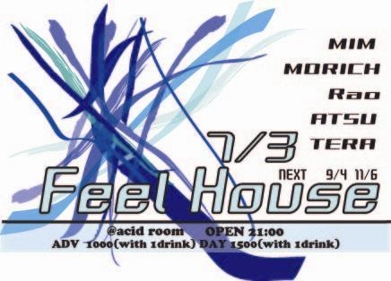 HOUSE MUSICを体で感じてもらいたい! そんなイベント目指してます!! 今流行のJーハウスからトライバル、NY HOUSE、RockHOUSEまでいろんなHOUSEが聞けちゃいます!! お客さんや、DJが一緒に仲良く、楽しめるイベントです!! 7/3(thu) HOUSE Feel House DJ>>MIM/MORICH/RAO/ATSU/TERA START 21:00 前売り/MEMBER \1000(with 1drink) 当日 \1500(with 1drink) 場所;ACIDROOM(札幌市中央区南4条西6丁目タイキビルB3F )