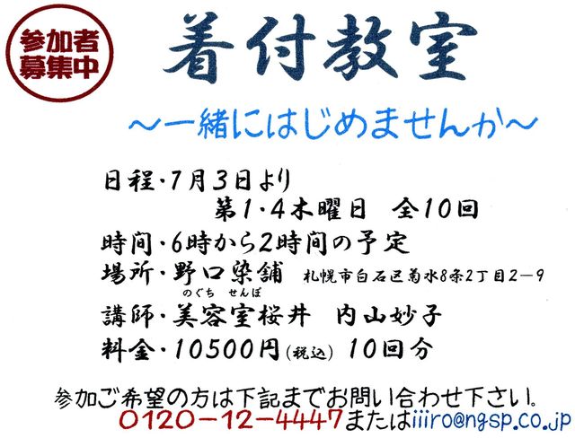 〜着付教室のお知らせ〜 着物を着れるようになりたい!長い間きていなくて忘れてしまった。着付けの学校に通うのはちょっと・・色々な思いの方がいられると思います。 是非、着付教室に参加してみませんか?少人数で行いますので定員になり次第締め切らさせていただきます。 日程:7月3日(木)より第1・4木曜 全10回 時間:夕方6時から2時間くらいを予定 場所:白石区菊水8条2丁目2−9 野口染舗 料金:10,500円(10回分) お問い合わせは、0120-12-4447またはiiiro@ngsp.co.jp