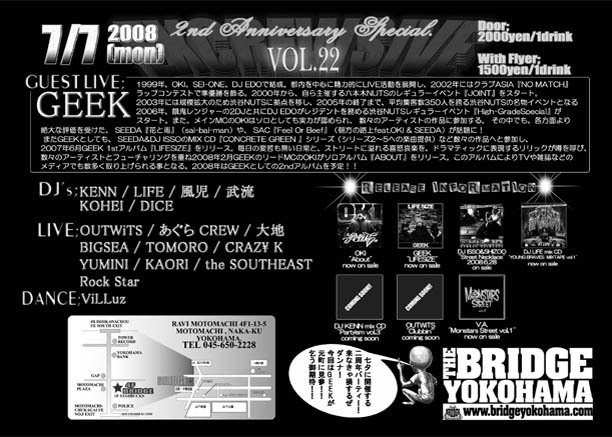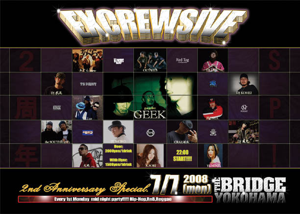 008.07.07 EXCREWSIVE vol.22 website→http://16.xmbs.jp/excrewsive/ @THE BRIDGE YOKOHAMA website→http://www.bridgeyokohama.com/ コミュ→http://mixi.jp/view_community.pl?id=267802 OPEN:22:00- door:\2000/1D with flyer:\1500/1D GUEST LIVE; GEEK DJ; KENN / LIFE / 風児 / 武流 / KOHEI / DICE LIVE; OUTWiTS / あぐらCREW / 大地 / BIGSEA / TOMORO / CRAZ\ K / YUMINI / KAORI / the SOUTH EAST / Rock Star DANCE; ViLLuz ゲスト取りますので来れる方はメッセージくださいな♪