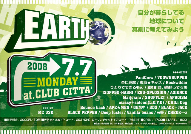 ダンサーでも経験があるはずです。 練習場所がゴミやタバコで汚れていた事が。 そろそろ自分の住んでる地球について真剣に考えませんか? このイベントではエコロジーについて理解してもらう趣旨で開催します。 7月7日(月曜) EARTH vol.1 @クラブチッタ川崎 ADV:2000円/1d別 チケットぴあ: Pコード 293-434 ローソンチケット:L コード 76846 OPEN:17:00 START:18:00 END:22:00 ◆Guest PaniCrew 7DOWN8UPPRE 杏仁豆腐 東京★キッズ ひとりでできるもん BMH~ばい菌持ってる鳩 ISOPP&