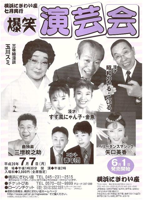 横浜にぎわい座 7月興行 【爆笑演芸会】 場 所 横浜にぎわい座 期 日 平成20年7月7日(月) 14:00開演(13:30開場) 料 金 3,000円 全席指定 出 演 昭和のいる・こいる(漫才)、玉川スミ(三味線漫談)、 すず風にゃん子・金魚(漫才)、三増紋之助(曲独楽)、 矢口美香(ベリーダンスマジック)、青年団(コント) 詳しくは: http://tobik1989.hp.infoseek.co.jp/info_4.html