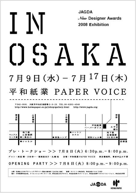 日本グラフィックデザイナー協会(JAGDA)が、 1983年より毎年選出している「JAGDA新人賞」。 新鮮かつ質の高い、39歳以下のグラフィックデザイナー数名に授与しており、 おかげさまでデザイン・広告界では認知度が上がってきました。 2008年度は以下の4名が受賞。 今年も心斎橋の平和紙業PAPER VOICEで 7月9日より新人賞作品展を巡回開催します。 前日の7月8日夜にはプレイベントとして、 4人のトークショー+オープニングパーティーを行います。 入場無料の気軽な、でもなかなか深いトークになると思いますので グラフィックデザインや