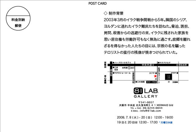 このたび、大阪・本町において 中野智文写真展「Little Baghdad」(リトル・バグダッド)を開催することになりました。つきましては告知させていただきます。 2008年7月8日(火曜日)〜20日(日曜日) ■81 LAB.GALLERY(エイトワン・ラボ ギャラリー) 〒541-0057 大阪市 中央区 北久宝寺町3-4-1 MERMAID 4F TEL+FAX:06-6244-0044 http://www.81lab.com/ 12:00〜19:00 月曜休廊 (写真展内容) 2003年3月のイラク戦争開戦から5年。隣国のシリア、ヨルダンに逃れたイラク難