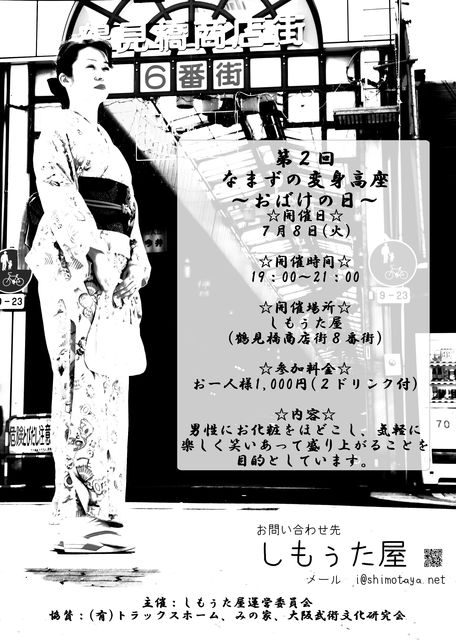 鶴見橋商店街8番街の「しもぅた屋」にて、ちょっとユニークなイベントを開催します。 プロの美容部員さんが男性にお化粧をほどこす、というちょっとフザケタ(?)催しです。 「本格的な女装願望はないけれど、“おためし”で1回化けてみたいねん」 とか 「ストレス発散にちょっとメイクアップとかしてみたい」 とか、 気楽に楽しく笑いあって盛り上がることを目的としています。 お気軽にどうぞ☆ 主催:しもぅた屋(鶴見橋商店街8番街・鶴見橋ダウンタウンホステル2階) 参加料金:お一人様1,000円(2ドリンク付) 参考コ