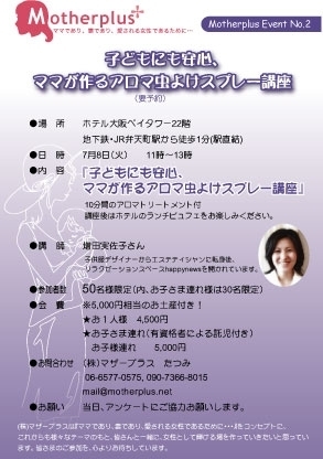 『子どもにも安心、ママが作るアロマ虫よけスプレー講座』(要予約) ●場 所 ホテル大阪ベイタワー22階 地下鉄・JR弁天町駅から徒歩1分(駅直結) ●日 時 7月8日(火) 11時〜13時 ●内 容 『子どもにも安心、ママが作るアロマ虫よけスプレー講座』 10分間のアロマトリートメント付 講座後はホテルのランチビュフェをお楽しみください。 ●講 師 増田実佐子さん 子供服デザイナーからエステティシャンに転身後、 リラクゼーションスペースhappynewsを開かれています。 ●参加者数 50名様限定(内、お子さま連れ様は30名限定