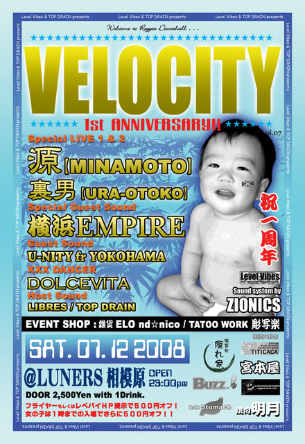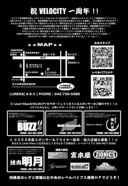 相模原のダンスVELOCITYがいよいよ一周年!! 【お知らせ】 レベバイ携帯専用HPできました http://mg1.jp/u/LEVELVIBES/ ↑みなさん携帯にご登録願います! Level Vibes&TOP DRAIN presents. ≪VELOCITY vol.7 1周年SP≫ ■日程:2008.07.12 SAT ■時間:11:00 START ■場所:相模原LUNERS ■住所:神奈川県相模原市相模原5-7-9 SKビル2F ■電話:042-750-5080 (ルネス) ■入場:2,500円1ドリンク付き ■フライヤー持参 or レベルバイブスHP画面提示で500円オフ! ■女の子は1:00AMまでの来場で更