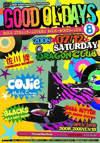 会 場:DRAGON CLUB http://www.dragon-club.asia/ 横浜市中区曙町1-2 平山ビル1F 045-262-2601 選 曲:COJIE (MIGHTY CROWN)、BLACKS (aka EAST BLAZE)、BULL HITTER、佐川修 音 響:BULL HITTER 2,000円 / 1D 24:00-