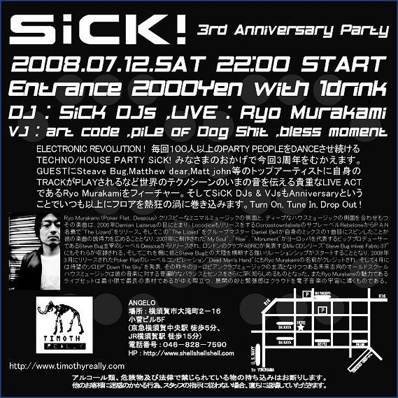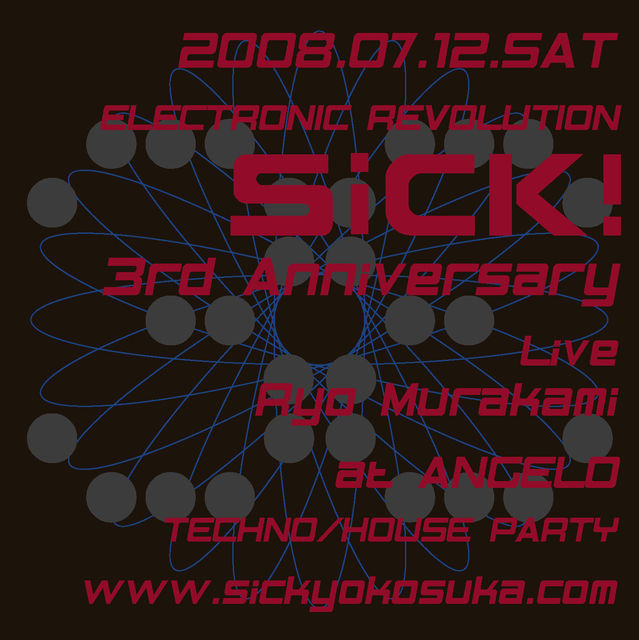 ELECTRONIC REVOLUTION! 神奈川県横須賀市で毎回100人以上のPARTY PEOPLEをDANCEさせ続ける TECHNO/HOUSE PARTY SiCK! みなさまのおかげで今回3周年をむかえます。 GUESTにSteave Bug,Matthew dear,Matt john等のトップアーティストに 自身のTRACKがPLAYされるなど世界のテクノシーンのいまの音を伝える 貴重な LIVE ACTであるRyo Murakamiをフィーチャー。 そしてSiCK DJs & VJsもAnniversaryということでいつも以上に フロアを熱狂の渦に巻き込みます。 Turn On,Tune In,Drop Out! SiCK! 3rd Anniversary Party 2008.07.1