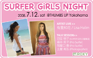 SURFER GiRLS NIGHT 海を愛する全ての女性の愛読書【SURFER GiRLS】がイベ ントにっ! 【SURFER GiRLS】オススメのアーティストライブや、他 では聞けないプロサーファー&カメラマン&編集長 のトーク・セッションなど、海ラブなガールズ必見 のスペシャル・ナイト。もちろんメンズもOK!! 来場者全員にROXYからバスジェルをスペシャル・プ レゼント!! ■日時:2008年7月12日(土) OPEN18:00/START19:00 ■会場:横浜 サムズアップ ■出演: LIVE >>有里知花 、 Lisa Halim オープニングアクト >> 平井大 、 Arisa Safu 、 AO A