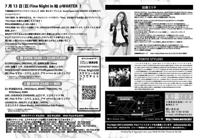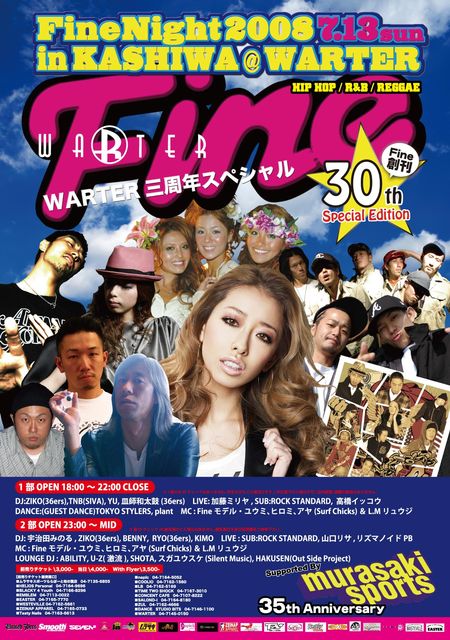 千葉県最大規模のサウンドスペースとして2005年にオープンしたSound Space Caf WARTERの三周年スペシャルイベント!!今年で創刊30周年を迎える、サーフ&ストリートマガジン「Fine」がお届けする全国人気クラブイベント「Fine Night」を盛大に開催しちゃいます!昨年は来場者数なんと800人超え。毎年毎年柏の皆様と共に成長してきました。今回はライブに、加藤ミリヤ,SUB:ROCK STANDARD, 山口リサ,