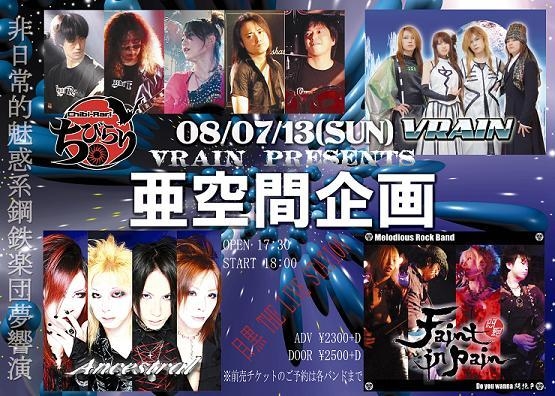 【Casts】 Faint in Pain/VRAIN/ちびらり/Ancestral 【Open/Start】 OPEN 17:30/START 18:00 ※Faint in PainはTOPに出演決定☆ 【Ticket】 前売/当日:¥2300/¥2500(ドリンク別) 【Comment】 最後に出演全バンドでセッション大会あり! あのバンドのあの曲で皆で一緒にジャンプしましょう!