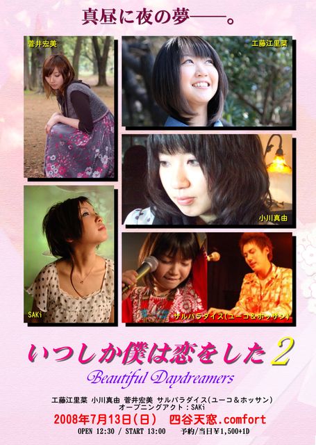 【いつしか僕は恋をした2 -Beautiful Daydreamers-】 イベント場所:四谷天窓.comfort(高田馬場) http://www.otonami.com/comfort/news/index.htm 時計時間:OPEN12:30/START13:00 チケットチケット:予約/当日有料1,500+1D カラオケ出演: ・菅井宏美ハート(13:50〜) ・工藤江里菜 ・小川真由 ・サルパラダイス(ユーコ&ホッサン) ・SAKi(オープニングアクト) 吟×takeboh共同企画第二弾。 今回より菅井宏美さんが参戦です。