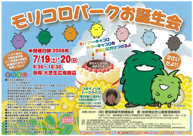 参加いただける方、募集しております。 19日(土)はあいちクローバーのキッコロが参加します。 ◇モリコロパークお誕生日会 7月19日(土)20(日)(会場:愛・地球博記念公園) 愛知県:http://www.pref.aichi.jp/0000016342.html