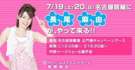 ■7月19日(土)・20日(日) ■名古屋競輪場・正門横キャンペンブース ■?12:05頃〜 ?15:20頃〜 ■トークショー&握手会 http://nagoyakeirin.com/index.html 名古屋付近にお住まいの方、遠征組の方、、、 イベント盛上げヨロシクお願いします!! なお、同日のスカパーにもゲストとして登場しますので、チェックを宜しくお願いします☆ http://keirin282.com/program/schedule.php?m=0