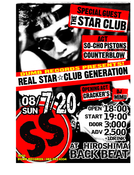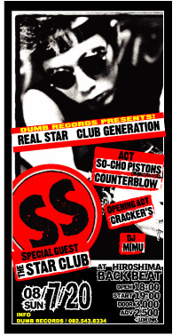 '08 7/20(日) DUMB RECORDS PRESENTS ☆REAL STAR CLUB GENERATION!!☆ @広島BACK BEAT OPEN: 18:00 START :19:00 前売¥2500 当日¥3000 + 1DRINK ●Special guest THE STAR CLUB(TOKYO) 早朝ピストンズ COUNTERBLOW ●Opening act CRACKER'S DJ/ MIMU