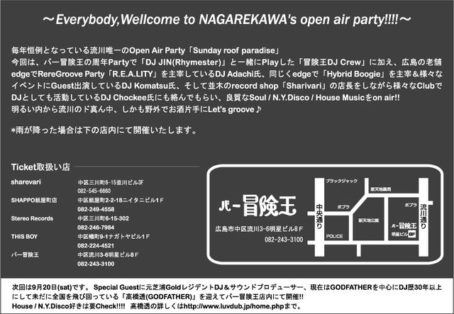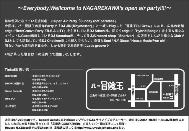 どうも! 流川で「バー冒険王」というSoul Barをやってるdragonです。 「交通の便が良い街中で野外パーティーが出来ないかなぁ?」と思い、自店であるバー冒険王の屋上を使い、流川のど真ん中でOpen Air Partyを始めて3年目。 今年もこの季節がやってまいりました〜!! という事で、毎年恒例となって来た流川唯一のOpen Air Party「Sunday roof paradise」を7月20日(祝日前日曜)に冒険王屋上で行います! ビール片手に野外で、しかも流川のど真ん中で音楽聴けるなんて、なんて贅沢な!!!!(帰りも楽チン) そして、他所