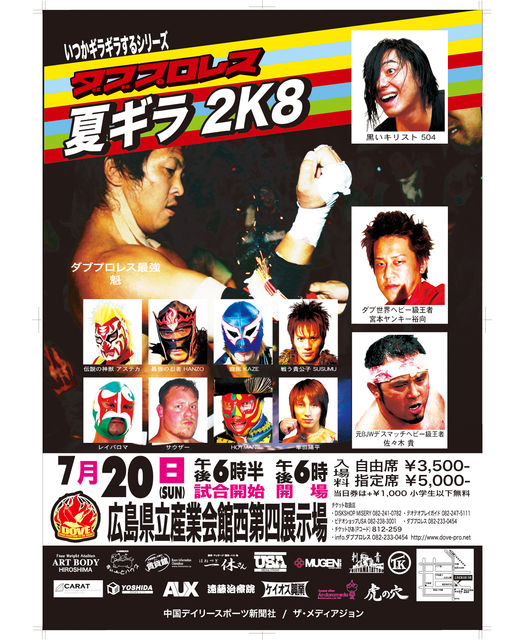 ダブプロレスが送る今年最初の夏祭り!「夏ギラ2K8」 2008年7月20日(日) 18:00開場 18:30開始 広島県立産業会館西館第四展示場 若き絶対王者、宮本裕向が連れてきたヤバいヤツ…。 元大日本プロレスデスマッチヘビー級王者、佐々木貴! この異常事態に504と魁が数年来の恩讐を乗り越え 3年振り一夜限りのタッグ結成!巨大な壁に挑む!! 悲願の王座奪取へ向けて弾みをつける事ができるか? はたまた返り討ちか!? 血で血を洗う最凶の一戦!! DOVE世界ヘビー級タイトルマッチ前哨戦 タッグマッチ60分一本勝負 試
