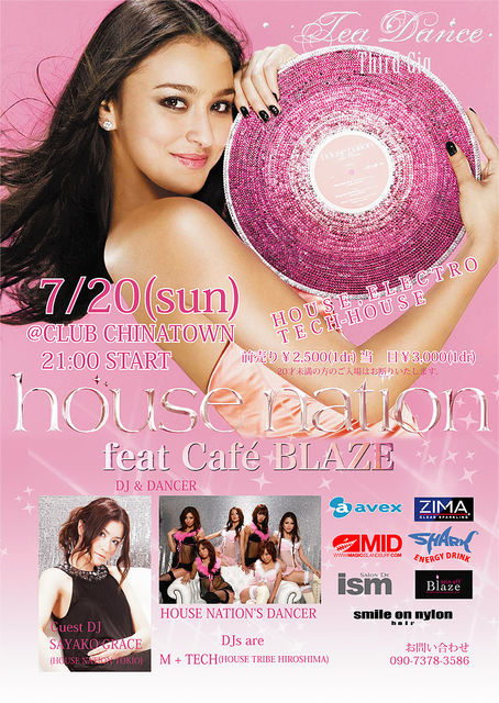 エイベックスがプロデュースする「HOUSE NATION」がついに広島で定期開催 される事になりました 毎奇数月に豪華なゲストを迎えて、オシャレかつエレガントなクラブパーティー を演出いたします 第一回目となる今回はゲストに「HOUSE NATION TOKIO」のレジデント SAYAKO GRACEや色気ムンムンのHOUSE NATION ダンサーを迎えての開催 Cafe Blazeとのタイアップで豊富なカクテルやスイーツも用意いたします 場所 Club Chinatown 時間 21:00 START 料金 前\2500(1Dr) 当\3000(1Dr) 前売り
