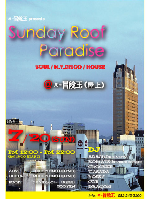 まいど〜dragonです。 やっと暑くなって来ましたね〜(というか蒸し暑い) やっと屋上パーチーの季節になりましたね〜 という事で、毎年恒例となって来た流川唯一のOpen Air Party「Sunday roof paradise」を7月20日(祝日前日曜)に冒険王屋上で行います! ビール片手に野外で、しかも流川のど真ん中で音楽聴けるなんて、なんて贅沢な!!!! もちろん、冒険王パーチーで恒例となってきた「チキン煮込みカレー」もご用意。 今回は、昼から開催ですので、ご家族での参加でも全然大丈夫! 皆さん、是非遊びに来てくださいね