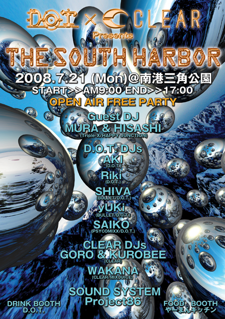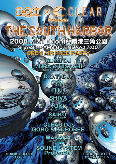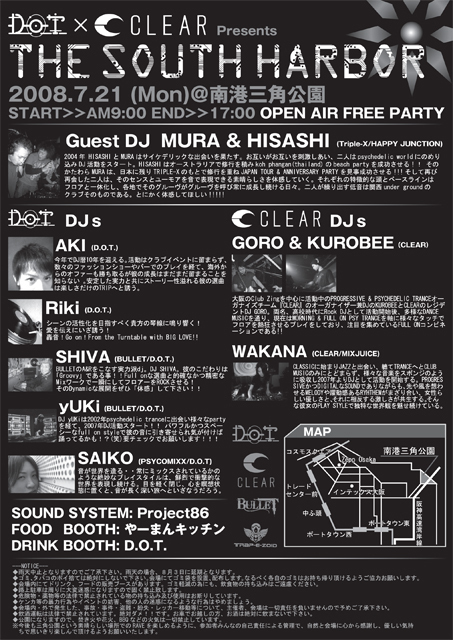 D.O.T. × CLEAR Presents ★OPEN AIR FREE PARTY★ -THE SOUTH HARBOR- 2008.7/21 (Mon)@南港三角公園 START>>9:00 END>>17:00 ◆Guest DJ◆ MURA & HISASHI (Triple-X/HAPPY JUNCTION) ◆D.O.T. DJs◆ AKI (D.O.T.) Riki (D.O.T.) SHIVA (BULLET/D.O.T.) yUKi (BULLET/D.O.T.) SAIKO (PSYCOMIXX/D.O.T.) ◆CLEAR DJs◆ GORO & KUROBEE (CLEAR) WAKANA (CLEAR/MIXJUICE) ◆SOUND SYSTEM◆ Project86 ◆DRINK BOOTH◆ D.O.T. ◆FOOD BOOTH◆ やーまんキッチン !!!NOTICE!!! ◆雨天