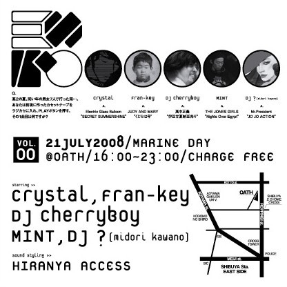 管理人様、告知失礼致します。 【Q】 高2の夏、同い年の男女7人で行った海…。 あなたは前夜に作ったカセットテープをラジカセに入れ、PLAYボタンを押す。 その1曲目は何ですか? ☆ ! ☆ ! ☆ ! ☆ ! ☆ ! EXPO 00 -New Party- 7/21(海の日) 16:00〜23:00 @OATH 渋谷区青山4-5-9 【Charge FREE!!】 CRYSTAL FRAN-KEY DJ Cherryboy MINT DJ ? (midori kawano) sound styling by HIRANYA ACCESS flyer by curryprince <FOOD> curry:天狗食堂 BJ(BBQ):うすい会 & カキ