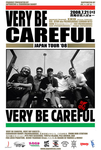 今最も勢いのあるCUMBIAバンド、VERY BE CAREFUL。昨年の朝霧ジャムでヘッドライナーを務め、アンコールが鳴り止まないほどのパフォーマンスを披露した事も 記憶に新しいのではないだろうか。L.Aのストリートからバンドをスタートした彼ら。CUMBIA、VALLENATO等のカリビアンルーツミュージックを、カフェ、電車内、ハロウィンパーティーや結婚式場・・・あらゆる場所で演奏。10年以上の地道な活動が口コミで広がり、カリフォルニアのラジオ、アルゼンチン、メキシコのクンビアシーンでヒットを飛ばした。彼らの