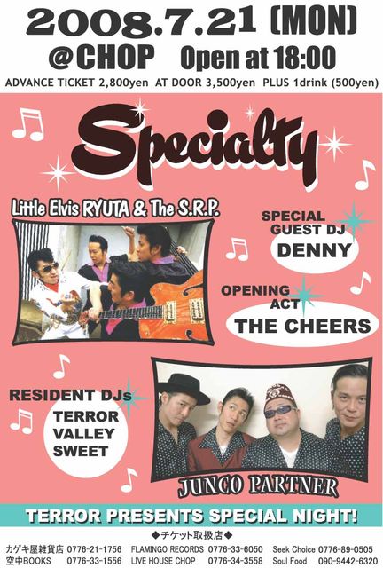 〜『 Specialty Vol.2 』 〜 【日時】7/21(祝、月) OPEN 18:00 【料金】前売り¥2,800- 当日\3,500- (入場時ドリンク代として別途\500-が必要となります。) 【場所】福井CHOP http://www.fukui-chop.com/ 【LIVE】JUNCO PARTNER Little Elvis RYUTA & S.R.P. The Cheers 【DJ】TERROR VALLEY SWEET 【GUEST DJ】DENNY 【チケット取り扱い店】 カゲキ屋雑貨店 0776-21-1756 FLAMINGO RECORDS 0776-33-6050 Seek Choice 0776-89-0505 空中BOOKS 0776-33-1556 LI